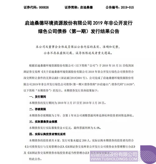 3月1日,啟迪桑德環(huán)境資源股份有限公司完成2019年非公開發(fā)行綠色公司債券(第一期)(債券簡稱“19啟迪G1”,債券代碼“114439”),本期債券的發(fā)行期間為 2019 年 2 月 27 日至 2019 年 2 月 28 日,發(fā)行實際募集資金 6 億元。實際認購本期債券的投資者均符合《公司債券發(fā)行與交易管理辦法》、《深圳證券交易所非公開發(fā)行公司債券業(yè)務管理暫行辦法》及《深圳證券交易所債券市場投資者適當性管理辦法》等各項有關要求。