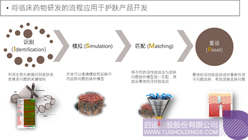 二、 功效成分篩選平臺。將臨床藥物研發(fā)的流程應(yīng)用于護(hù)膚產(chǎn)品開發(fā),針對不同皮膚衰老問題,建立集識別(Identification)、模擬(Simulation)、匹配(Matching)以及重設(shè)(Reset)為一體的I.S.M.R的流程。在此基礎(chǔ)上與分泌型天然多肽因子庫有機(jī)結(jié)合,目標(biāo)導(dǎo)向化高效篩選創(chuàng)新型多肽成分組合。