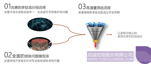 1)完善的多肽成分組合庫,種類與組合化,克服市場合成肽功效單一,無法進(jìn)行專利保護(hù)的問題;