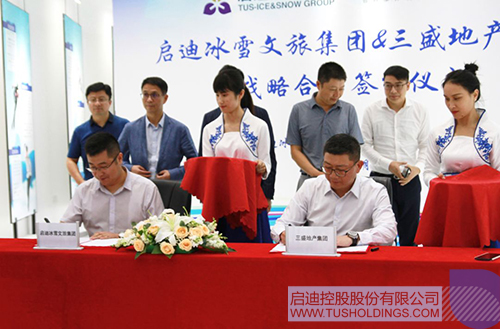 啟迪冰雪文旅集團(tuán)執(zhí)行總裁侯東亮和三盛地產(chǎn)集團(tuán)總裁馮勁義簽署了戰(zhàn)略合作協(xié)議。