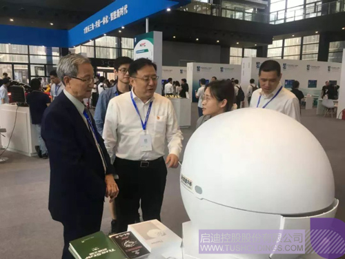清華大學(xué)原黨委副書記胡顯章、浙江清華長三角研究院院長王濤,參觀啟迪之星展位。