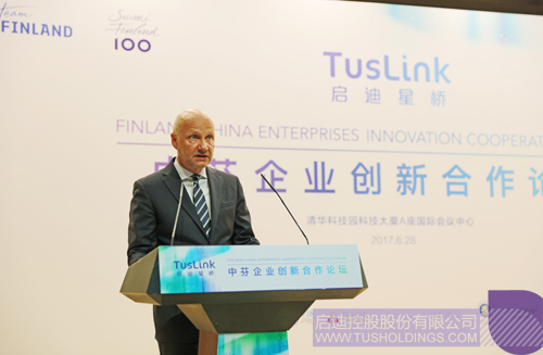 6月28日,值芬蘭共和國總理西皮萊閣下訪問中國之際,芬蘭貿(mào)易投資旅游促進(jìn)總署率芬蘭50余家知名企業(yè)和啟迪控股攜手舉辦“TusLink-中芬企業(yè)創(chuàng)新合作論壇”,旨在通過TusLink打造眾星互動的國際化創(chuàng)新生態(tài)系統(tǒng)。芬蘭經(jīng)濟(jì)與就業(yè)部副部長古澤森(Jari Gustafsson),啟迪控股副總裁、啟迪之星董事長張金生出席活動并致辭。