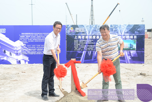 啟迪水務(wù)集團總經(jīng)理俞建中(左)和杭州院總工趙宏共同揮鍬為項目奠基