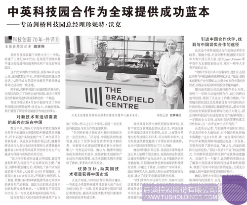 科技日報記者8月28日獨家專訪了劍橋科技園總經(jīng)理珍妮特·沃克女士,從她的視角,我們看到了兩國科創(chuàng)誠意合作結(jié)出的果實。