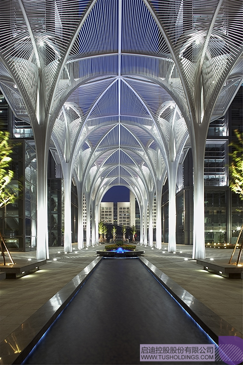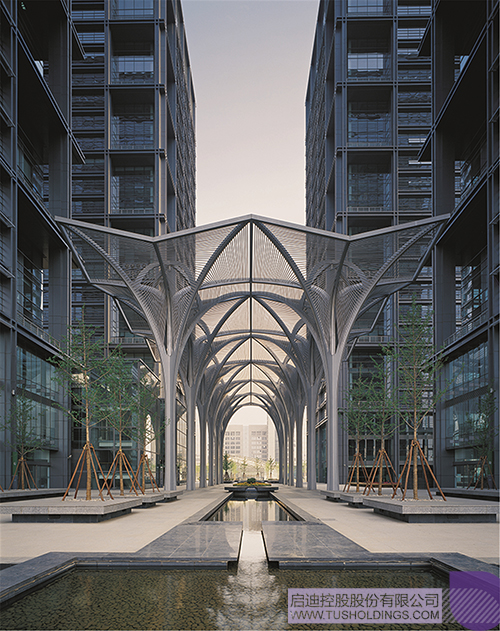 分列的四塔間隙為城市道路通向園區(qū)中心綠地打開了一條綠色通廊,中心是12顆參天鋼樹,形成灰空間的限定,與二層平臺(tái)自然的樹木共同營(yíng)造出積極的公共交往空間。“樹影婆娑”下是綠意盎然的休閑廣場(chǎng),展現(xiàn)人與自然共生共融的景象。建筑首層斜插入地下的草坪,標(biāo)準(zhǔn)層四角的綠色陽臺(tái)和頂層白色膜傘的屋頂花園無不體現(xiàn)了人性化、生態(tài)化的現(xiàn)代商務(wù)辦公理念。
